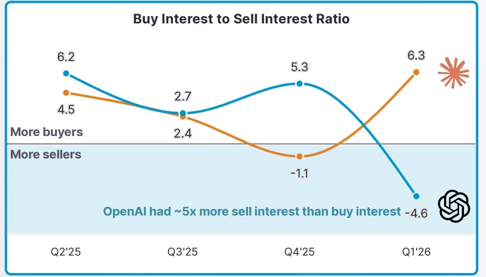 The OpenAI picture looks different. On Forge Global, OpenAI is trading at $880 billion—just 3% above its $852 billion valuation from its early-2026 fundraising round. Caplight found that in Q1, Sam Altman’s company reported more people interested in selling than buying it on secondary markets.