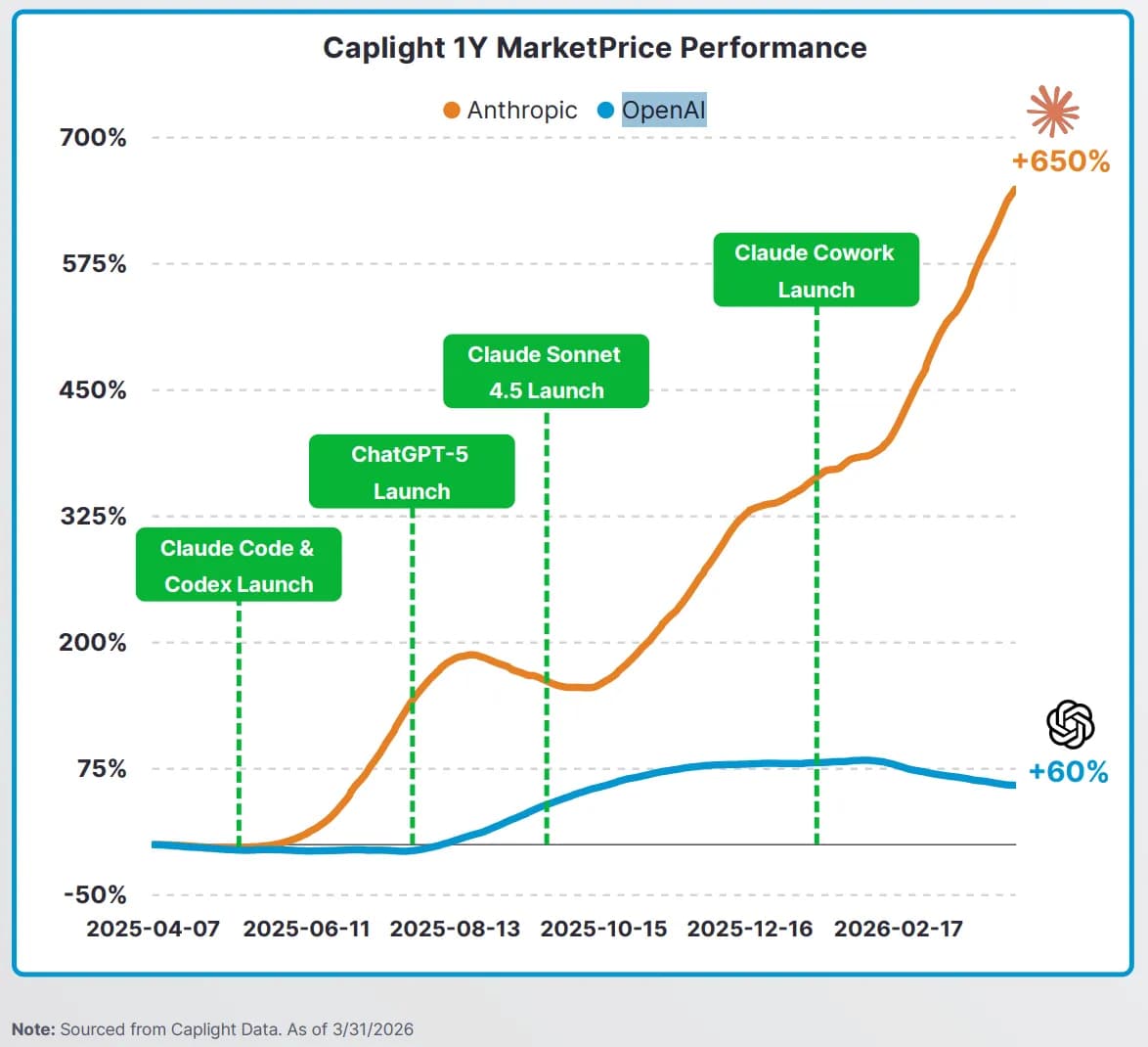 This mix of good deals (and good PR) have increased the appetite for Anthropic shares. Caplight, which tracks private-market share activity, reported that interest in Anthropic has spiked over 650% in the last 12 months.