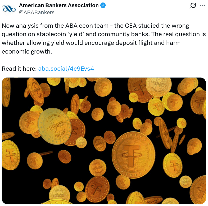 The American Bankers Association (ABA) has criticized a White House report that claimed banning stablecoin yields would only have a negligible impact on banks, arguing that the conclusion was reached by asking the “wrong question.”
