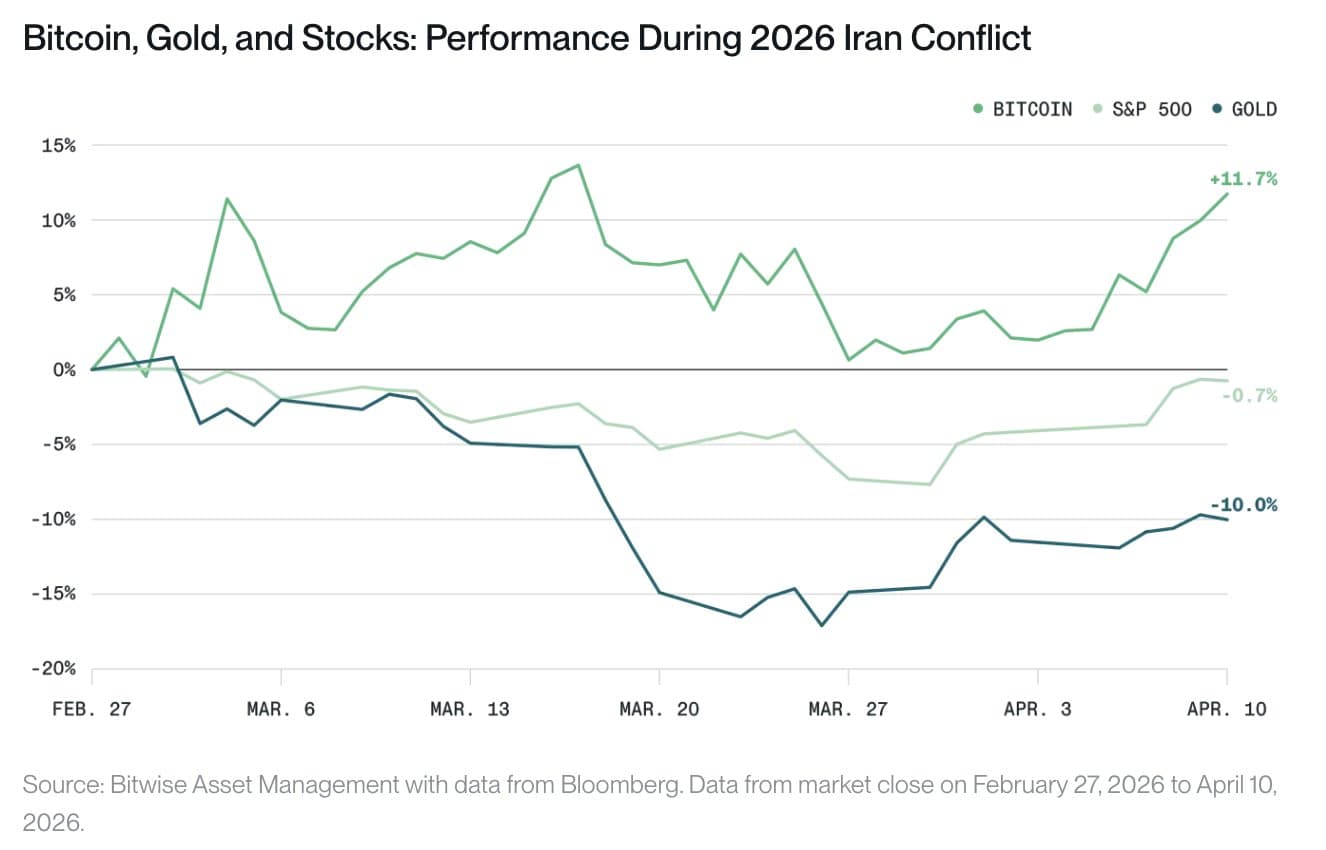 “Since U.S. and Israeli airstrikes began on February 28, bitcoin is up 12% while the S&P 500 is down 1% and gold has fallen 10%.”
