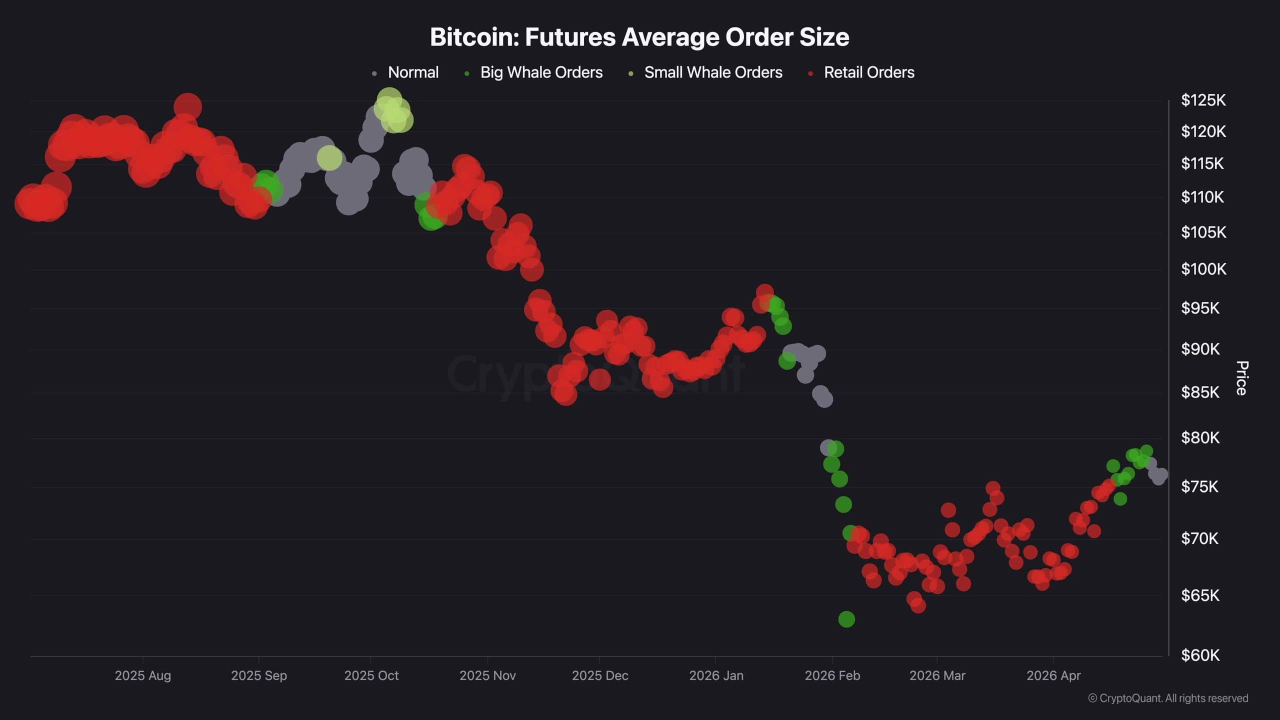 Throughout the entire corrective phase from late 2025 to March 2026, Bitcoin’s futures market was dominated almost exclusively by retail-sized orders, as the red dots blanket the price chart from $110k all the way down to $62k. This reflects a correction driven and sustained by smaller participants capitulating in a declining market. The first meaningful shift came near the February low, when a cluster of large whale futures orders appeared, which was the first institutional-scale futures activity in months.