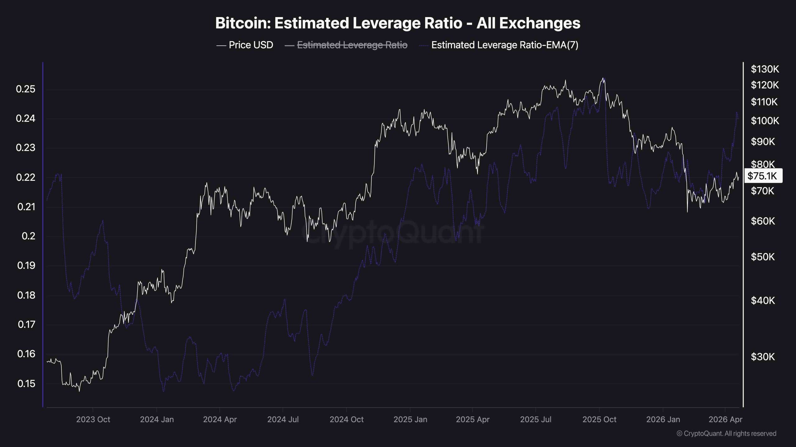 The Estimated Leverage Ratio across all exchanges has surged sharply in recent weeks, with the EMA(7) now pushing toward 0.24 and approaching the elevated levels last seen during the peak of the bull market in late 2025 when BTC was trading between $110k and $125k. This means traders are taking on significantly more leverage relative to the amount of BTC held on exchanges, at a price level that is still nearly 40% below those highs.