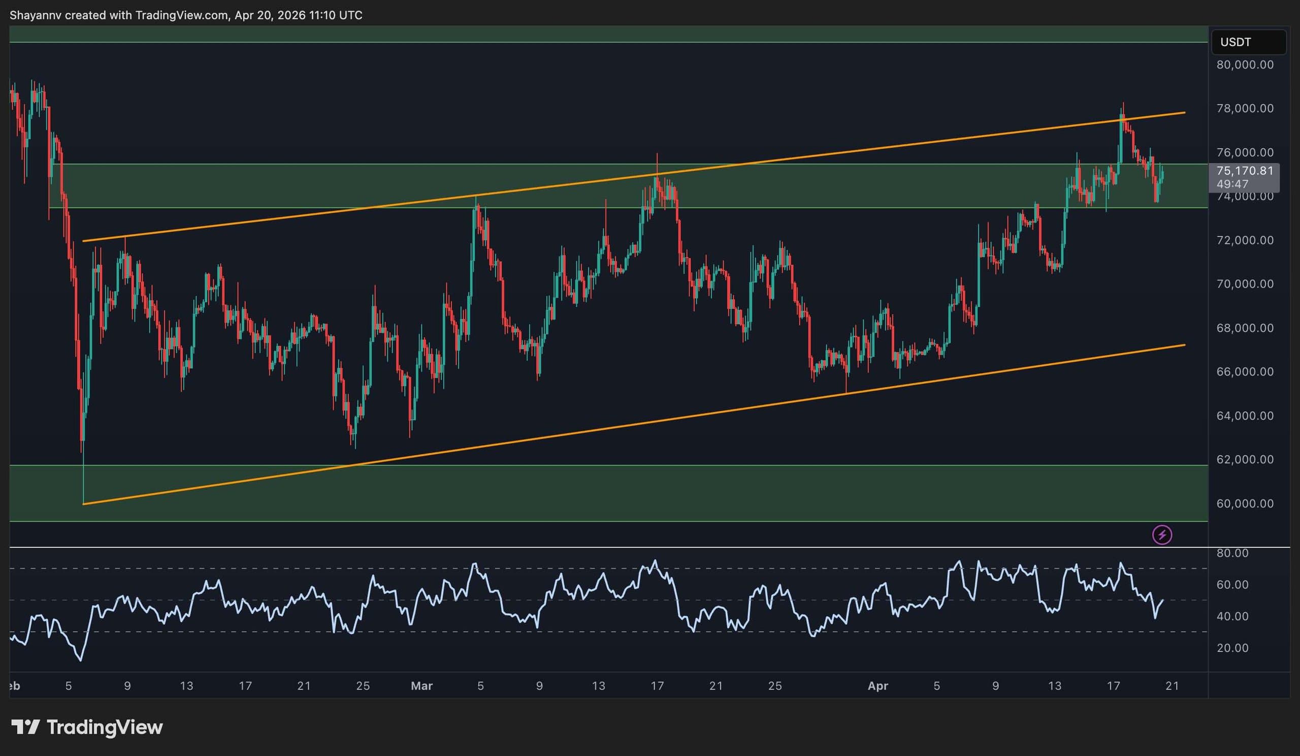 A reclaim of $76k with RSI holding above 55 would be the green light for another attempt at the upper channel boundary and beyond toward the $80k mark.