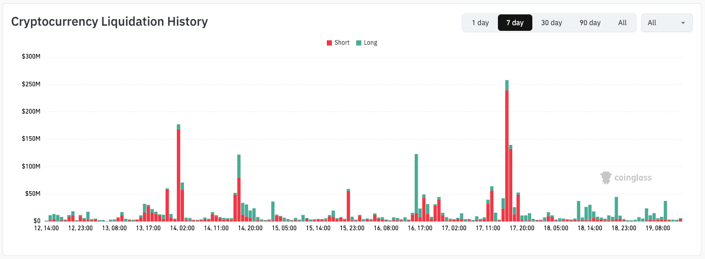 Crypto seven-day liquidation history (screenshot). Source: CoinGlass