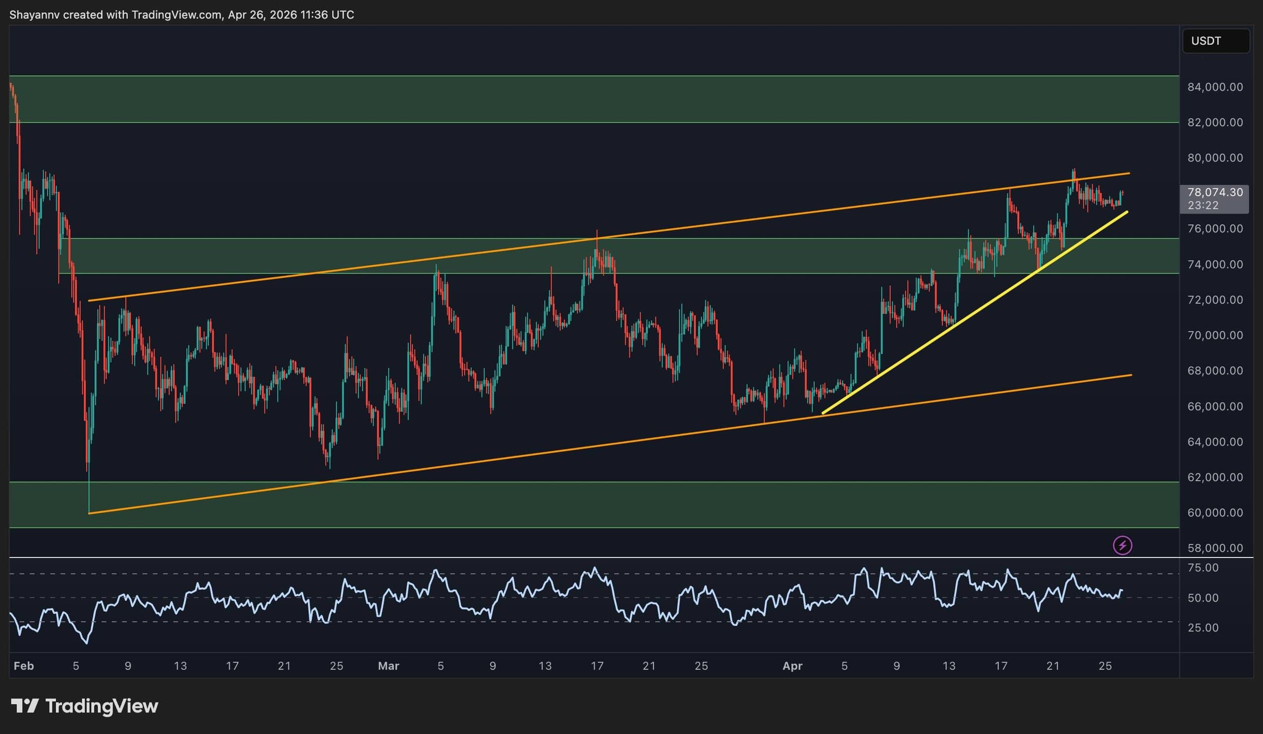 BTC is currently riding the upper half of the broader channel while the steeper trendline continues to provide dynamic support, now near $77k. The RSI is also hovering around 60, which is elevated but not flashing overbought signals. The upper boundary of the broader channel near $79k–$80k coincides with the key resistance level, making that zone the natural near-term ceiling.