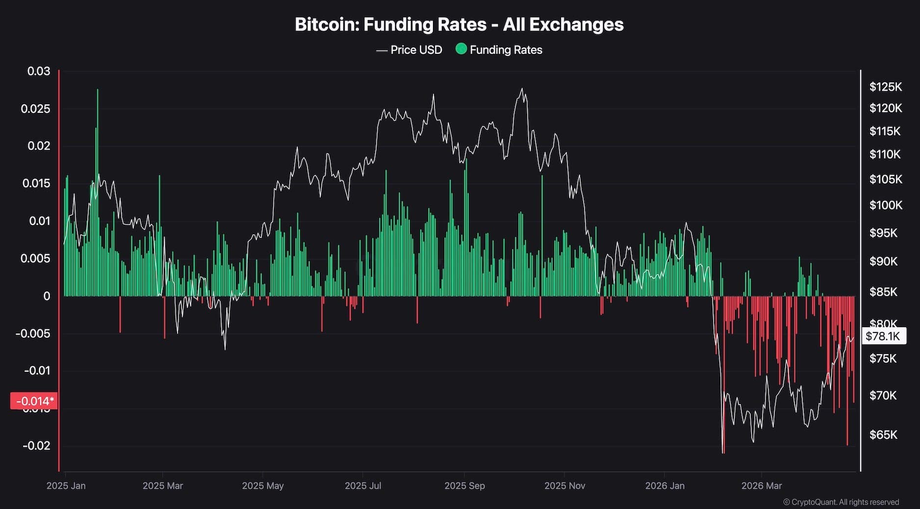 Sentiment-wise, there is a paradox that the funding rate chart presents. Despite BTC trading at $78k, which is its highest level since February, funding rates across all exchanges remain firmly negative, currently reading around -0.014. The red bar dominance that began in February has not resolved, even as the price has rallied more than 20% from the lows. Traders are still paying to hold short positions at levels that are approaching two-month highs.