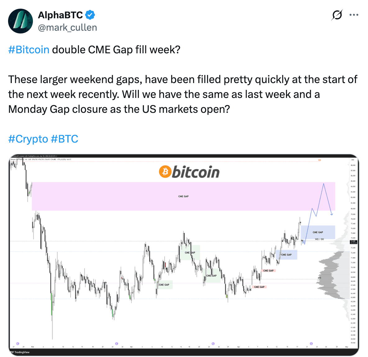 Analyst AlphaBTC said the BTC/USD pair might rise higher to fill the CME gap at $84,000, which was created at the start of February.