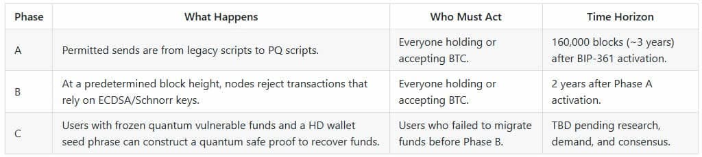 BIP-361 proposes that three years after activation, phase A of the proposal would prevent any new BTC from being sent to old-style addresses, with all users on quantum-resistant address types.