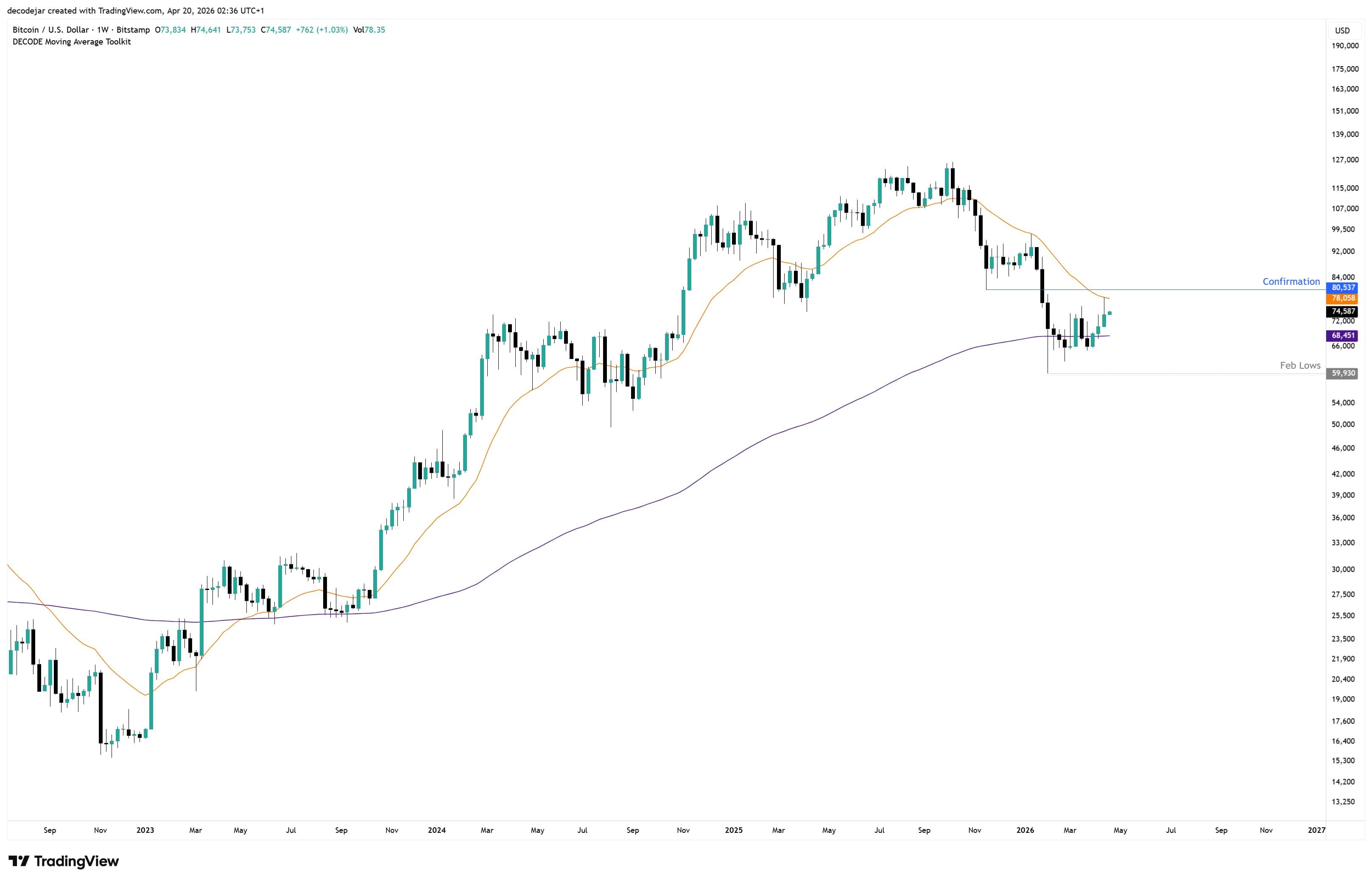 Bitcoin is currently facing resistance at multiple levels, with the nearest being the 21-week exponential moving average at $78,400.