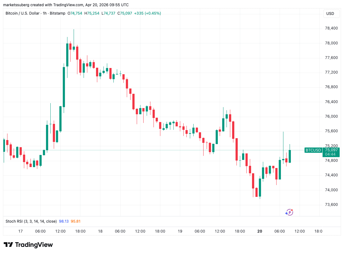 Bitcoin still managed a “green” weekly candle despite last-minute sellers driving price below $74,000.
