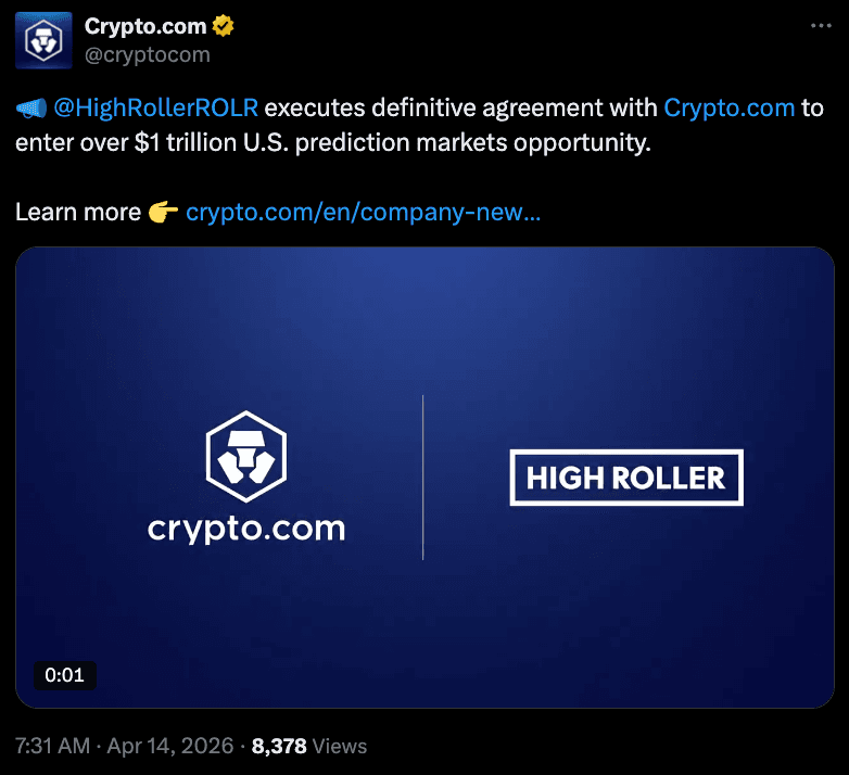 Crypto.com has partnered with High Roller Technologies to enter the prediction markets sector, competing with firms like Kalshi and Polymarket. The agreement allows Crypto.com to launch event-based prediction markets for US users through a CFTC-registered exchange.
