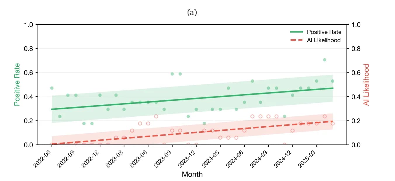 AI content showed positive sentiment scores more than 107% higher than human content. Researchers tie this to the well-documented of LLMs—trained on human approval signals, they produce text that feels sanitized, friction-free, and relentlessly upbeat.