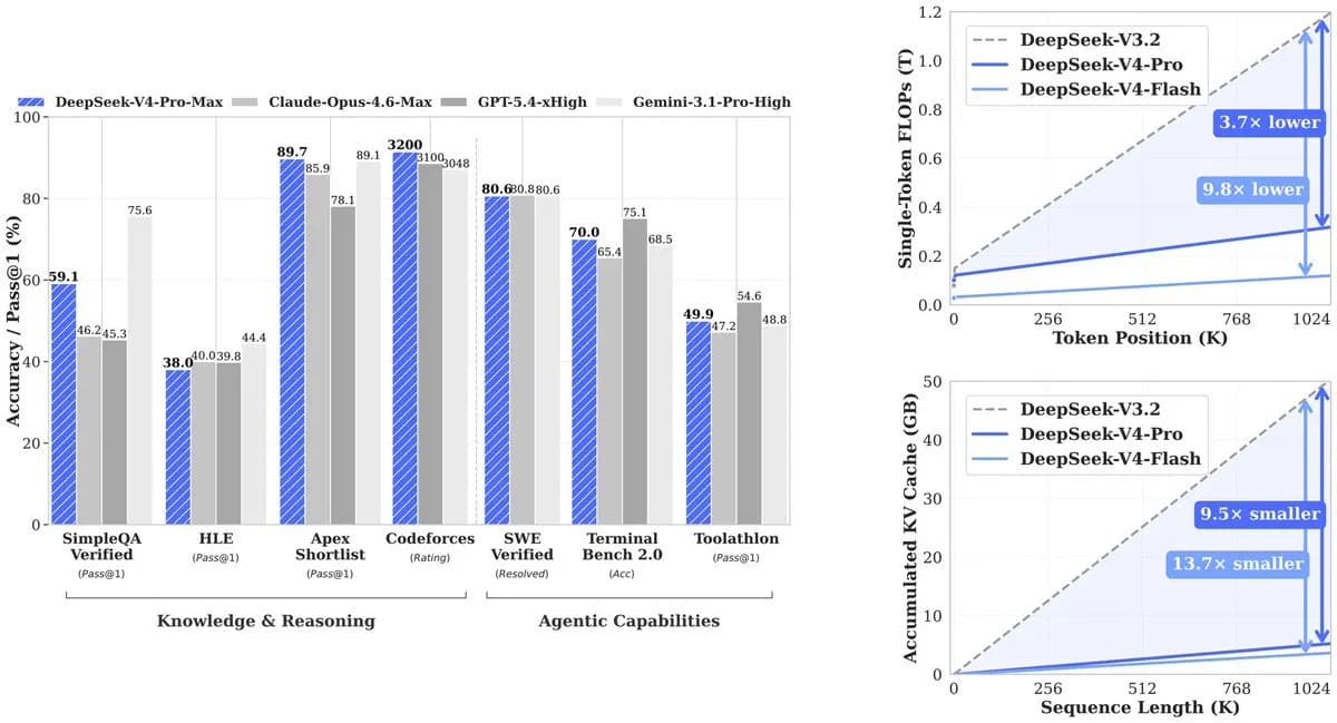 The result, from the technical paper: At one million tokens, V4-Pro uses 27% of the compute its predecessor (V3.2) needed. KV cache—the memory the model needs to track context—drops to just 10% of V3.2. V4-Flash pushes that further: 10% of compute, 7% of memory.