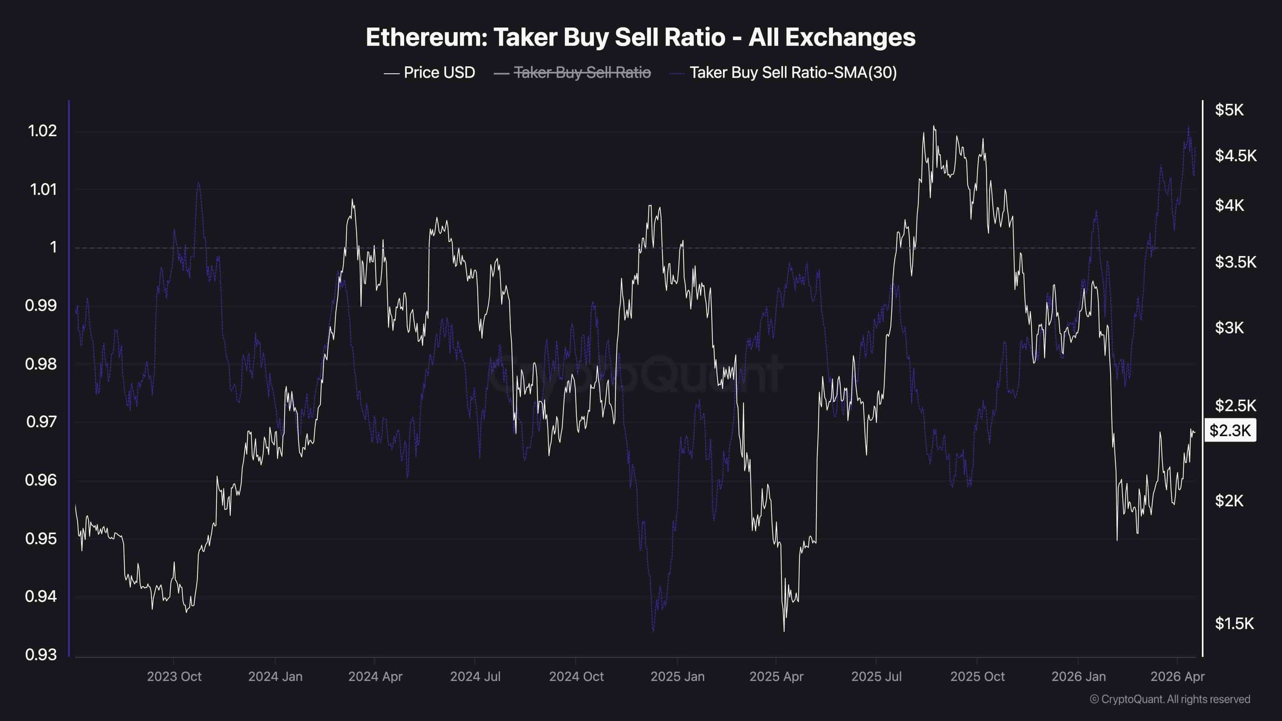 The 30-day moving average of the Ethereum Taker Buy/Sell Ratio has spiked to approximately 1.02, which is the highest reading in the entire dataset stretching back to mid-2023. This metric has been showing values below 1 for the majority of the past 3 years, and current readings indicate that aggressive market buyers are now significantly outpacing sellers in the futures market. The timing of this surge, coinciding with ETH’s push toward the $2.3k–$2.4k resistance zone, suggests the recent price action is being driven by genuine futures market demand rather than a passive drift higher.