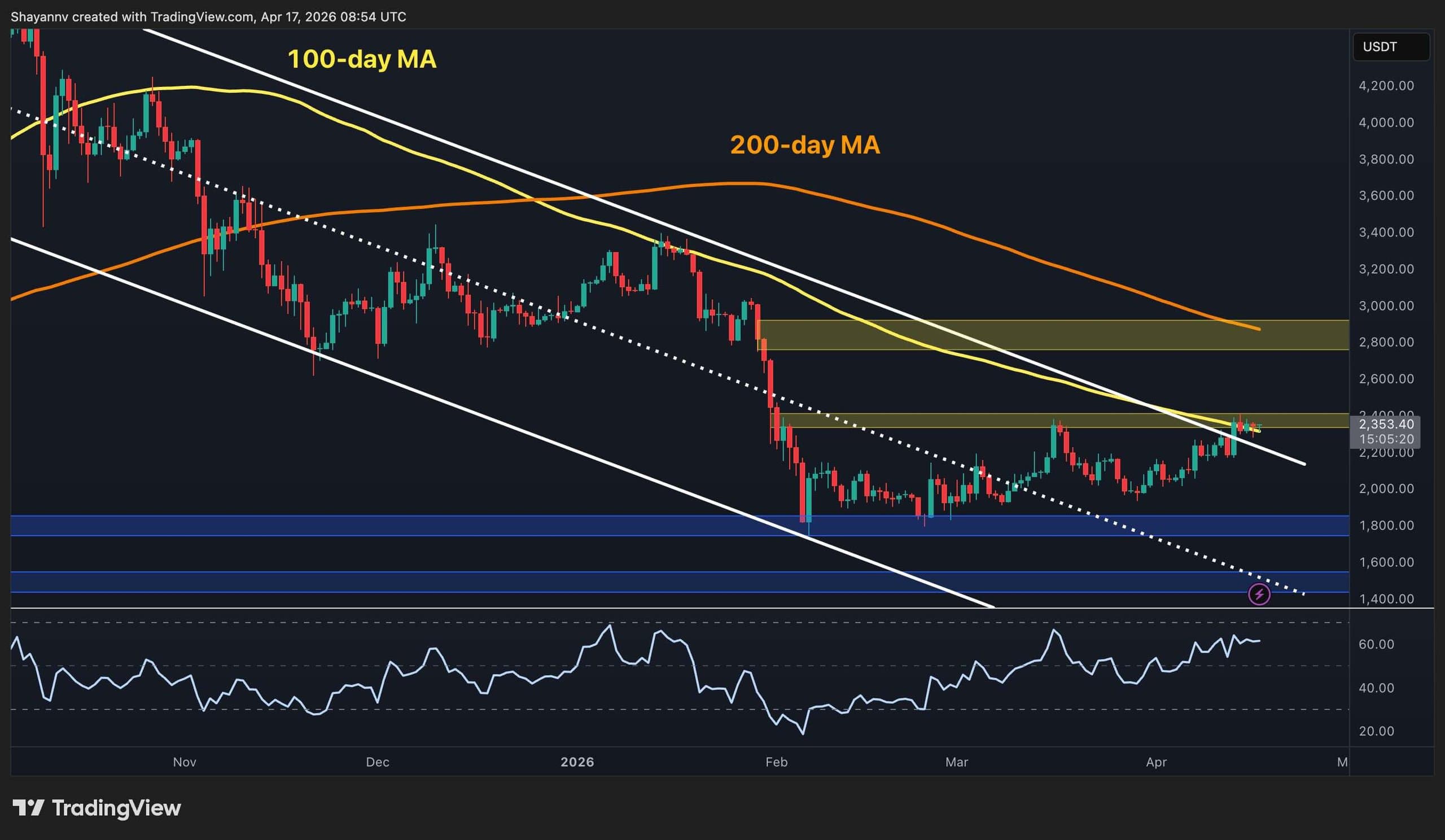 The key resistance levels are around $2.4k and the 100-day moving average.