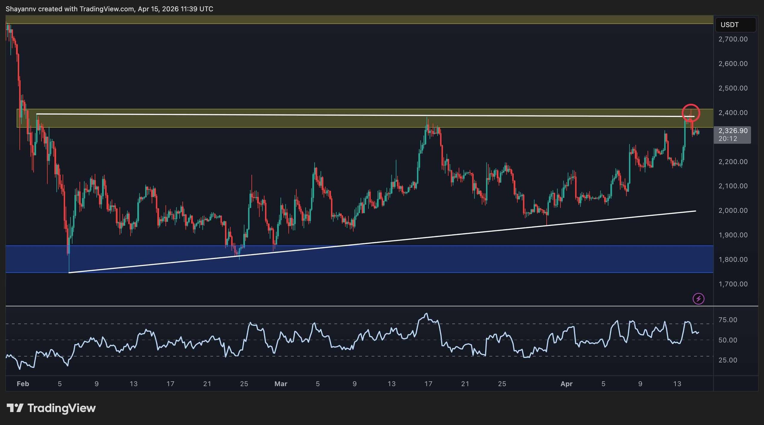 A pullback toward that trendline that holds would keep the bullish structure alive, and a clean close above $2.4k on cooling momentum would be a far more convincing signal than the spike-and-reject pattern seen so far. However, the $1.8k support zone remains the key downside reference if the mentioned trendline gives way.