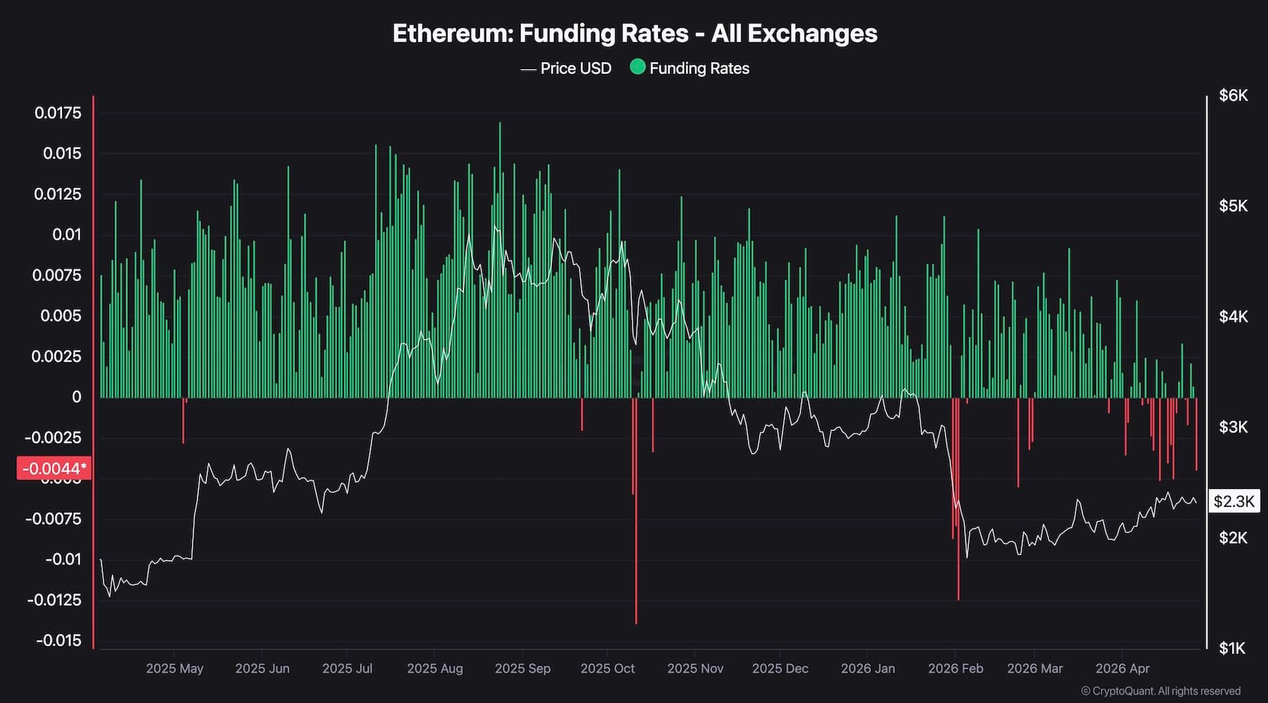 Unlike Bitcoin, where funding rates have been persistently and deeply negative throughout the recent dataset, Ethereum’s funding picture is more mixed. The current reading of -0.0044 is negative, but the chart shows that ETH’s funding has been oscillating between modestly negative and modestly positive for much of April, rather than sustaining the unrelenting red bar dominance seen on Bitcoin’s equivalent chart.