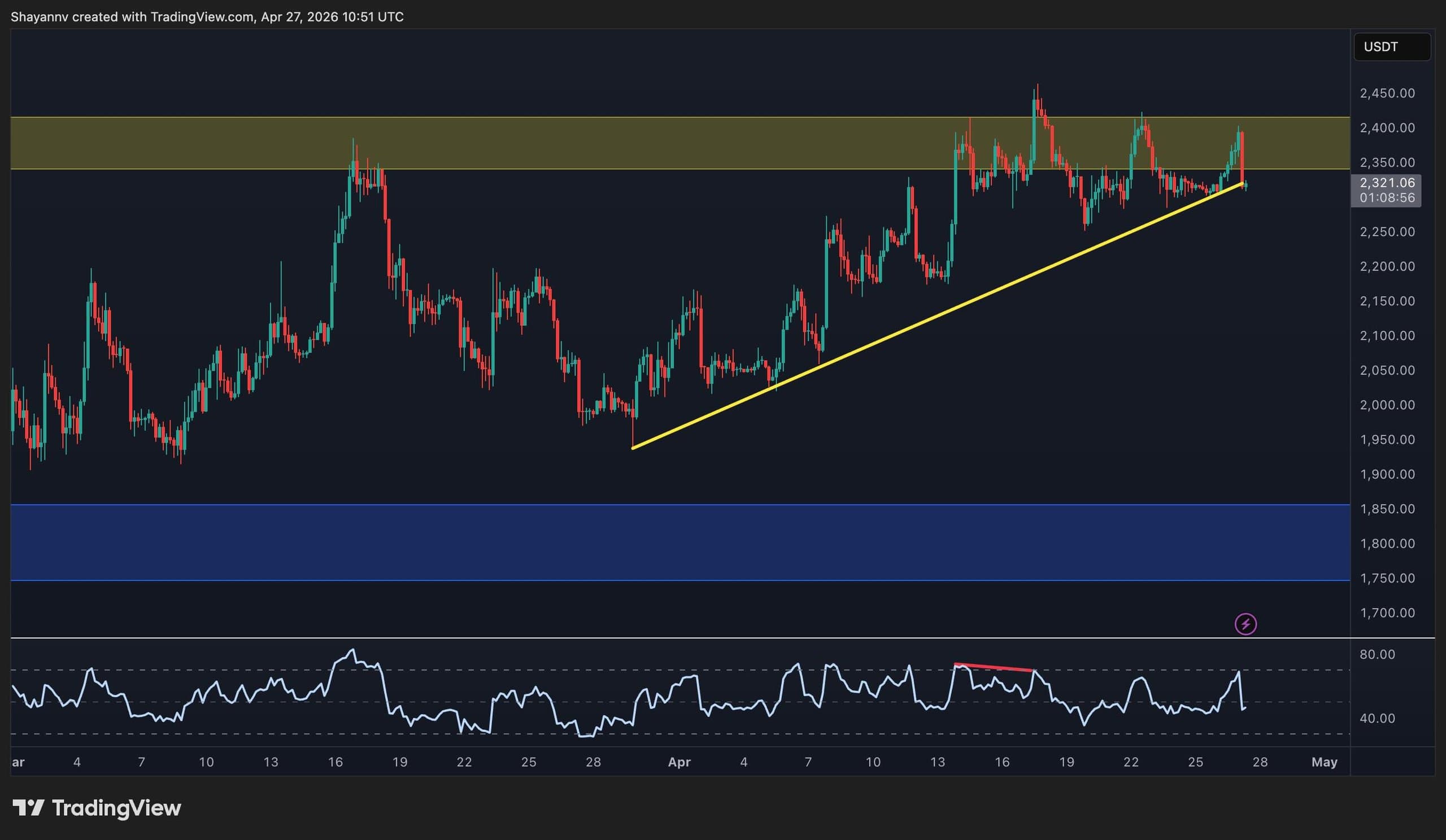 Ethereum is trading above $2.3k as April draws to a close, ending the month in a frustratingly familiar position. It is pressing against the same $2.4k resistance zone it has now tested repeatedly since mid-March without a clean resolution. ETH sits at the threshold of what could either be its most significant breakout in months or yet another rejection at the gate.