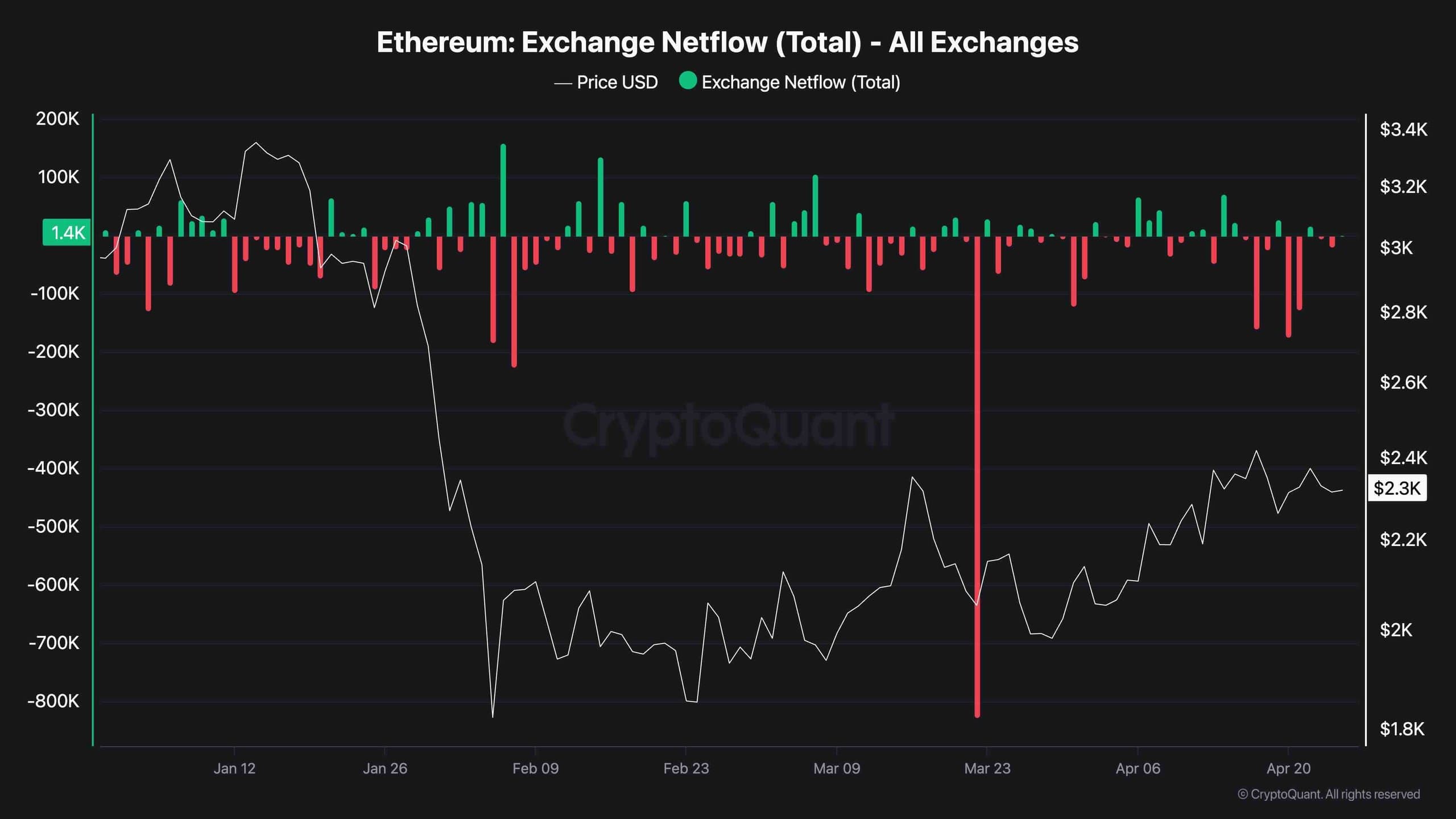 What is particularly striking is the acceleration in net outflows through April. Despite ETH failing to break above $2.4k, holders are continuing to withdraw ETH from exchanges at an elevated pace. This behavior points to conviction accumulation rather than opportunistic profit-taking.