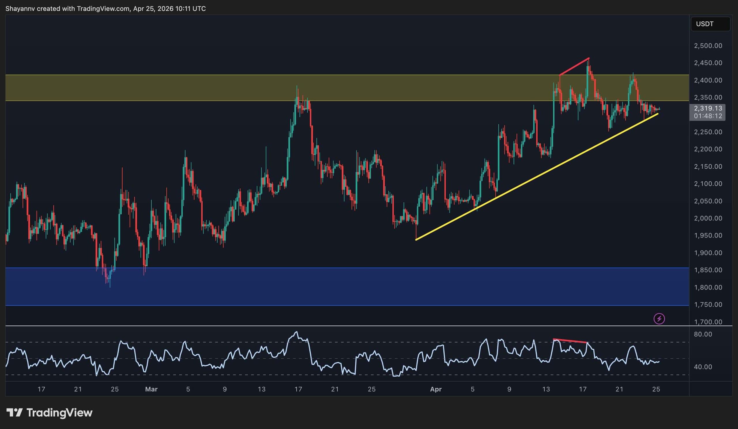 The 4-hour chart shows a sharper ascending trendline that has been guiding price since the late-March lows, now providing support near $2.3k. ETH is sitting directly on that trendline at the moment, having pulled back from the recent rejections at $2.4k. These rejections were accompanied by a bearish RSI divergence visible on the chart, where the price made a marginally higher high while RSI printed lower.