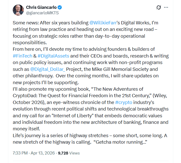 Giancarlo, referred to as “Crypto Dad” while in office for his crypto advocacy, posted to X on Sunday that he was leaving the law firm Willkie Farr & Gallagher and retiring from law altogether as he makes the switch to advising crypto and fintech companies.