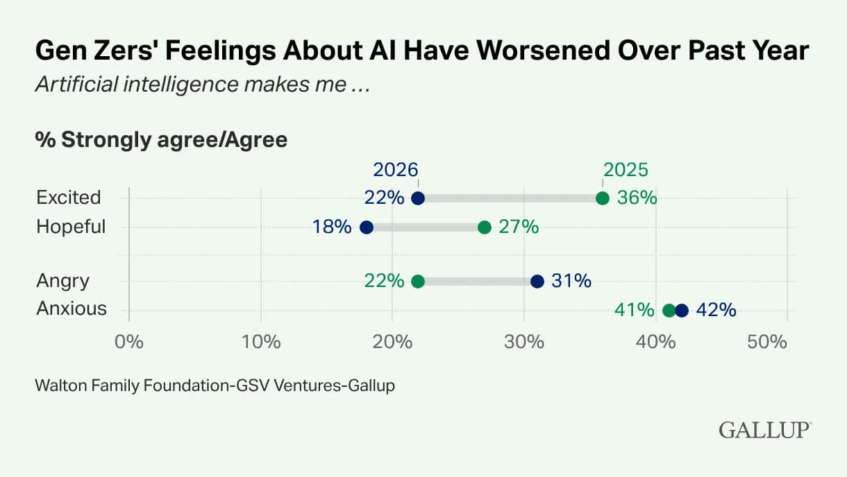 Excitement about AI dropped 14 percentage points to just 22%. Hopefulness fell 9 points to 18%. Anger climbed 9 points to 31%. These are not marginal shifts.
