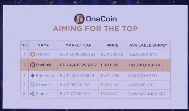Before it collapsed, OneCoin rose to become the second-largest cryptocurrency by market capitalization. Source: YouTube