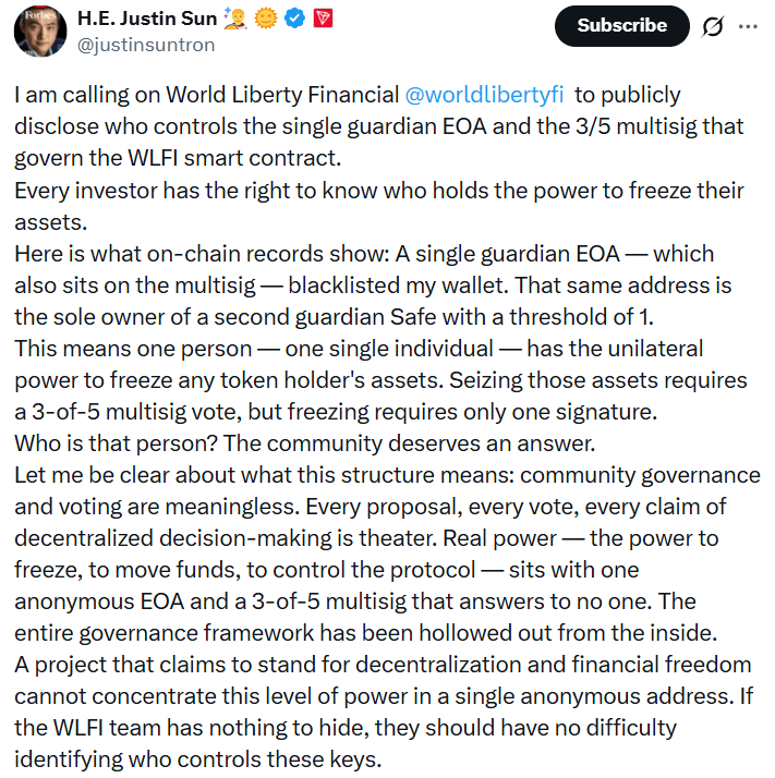 Justin Sun alleged that a single guardian wallet within WLFI's multisig structure has unilateral power to freeze token holders, which he claims was used to blacklist his wallet.