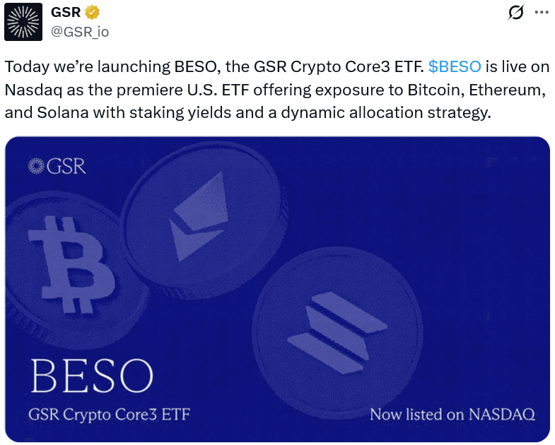 GSR launched its first crypto ETF, the GSR Crypto Core3 ETF (BESO), which tracks Bitcoin, Ether, and Solana, achieving nearly $5 million in trading volume on its first day.