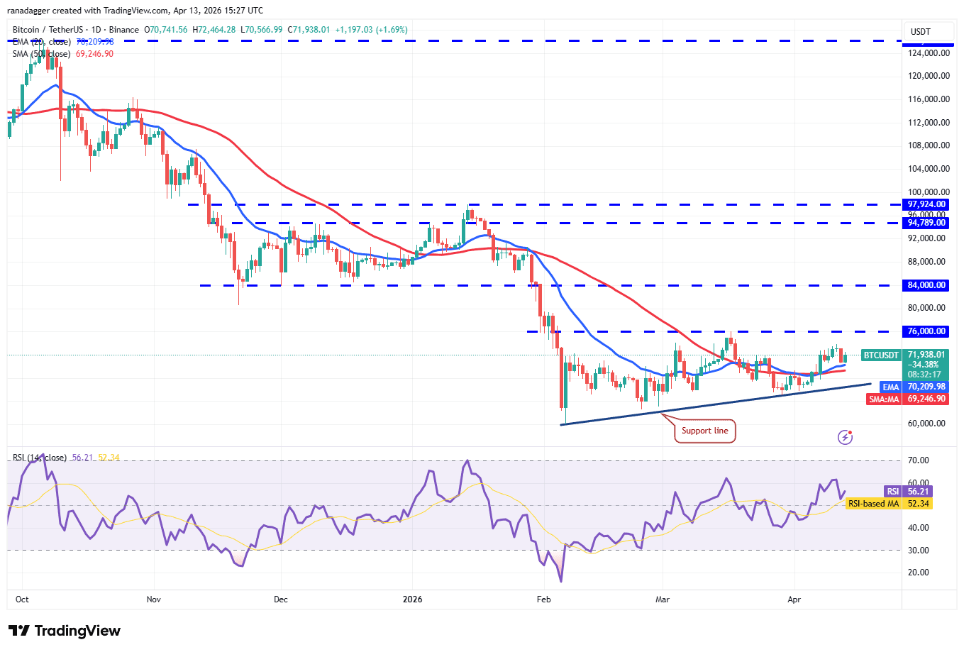 The bounce off the 20-day EMA on Monday indicates that the bulls are buying on dips. That increases the possibility of a retest of the critical $76,000 resistance. Sellers are expected to defend the level with all their might, as a close above $76,000 will complete a bullish ascending triangle pattern. That clears the path for a potential rally to $84,000.