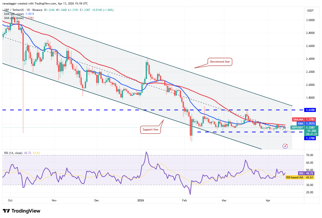 Sellers will attempt to gain the upper hand by pulling the XRP price below the $1.27 support. If they can pull it off, the XRP/USDT pair may descend to $1.11 and thereafter to the support line of the descending channel pattern.