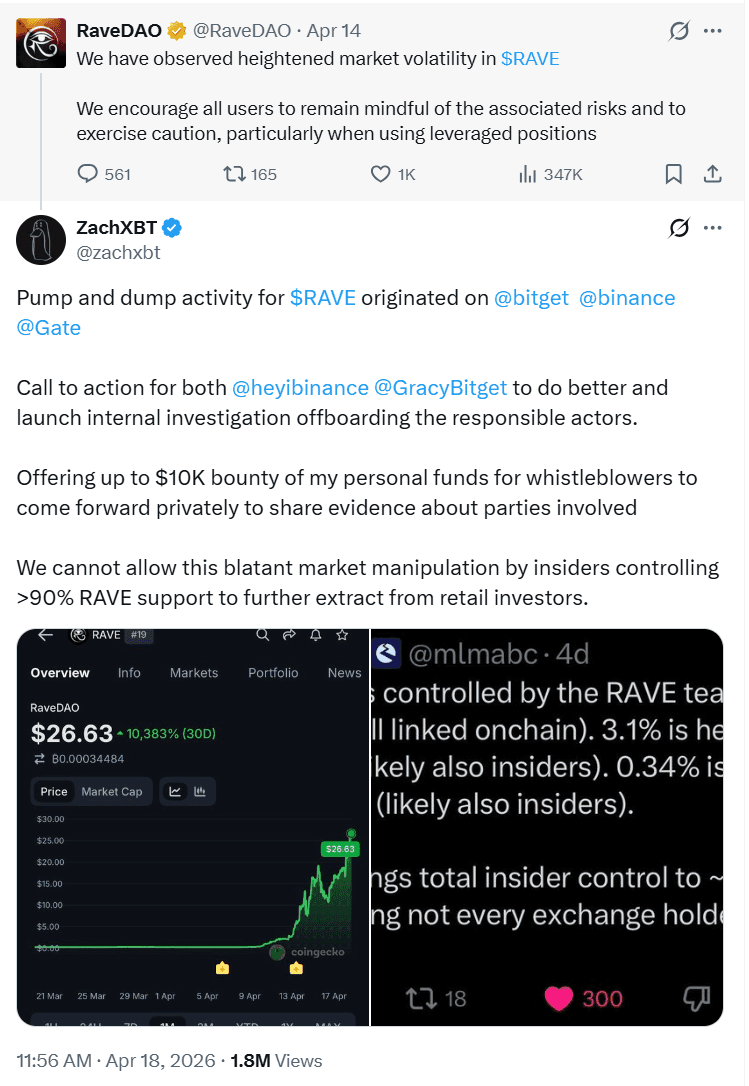 Both Binance and Bitget confirmed they are reviewing the situation. “We’re looking into it,” Binance CEO Richard Teng wrote, while Bitget CEO Gracy Chen said the exchange had “started investigating” RAVE trading activity.