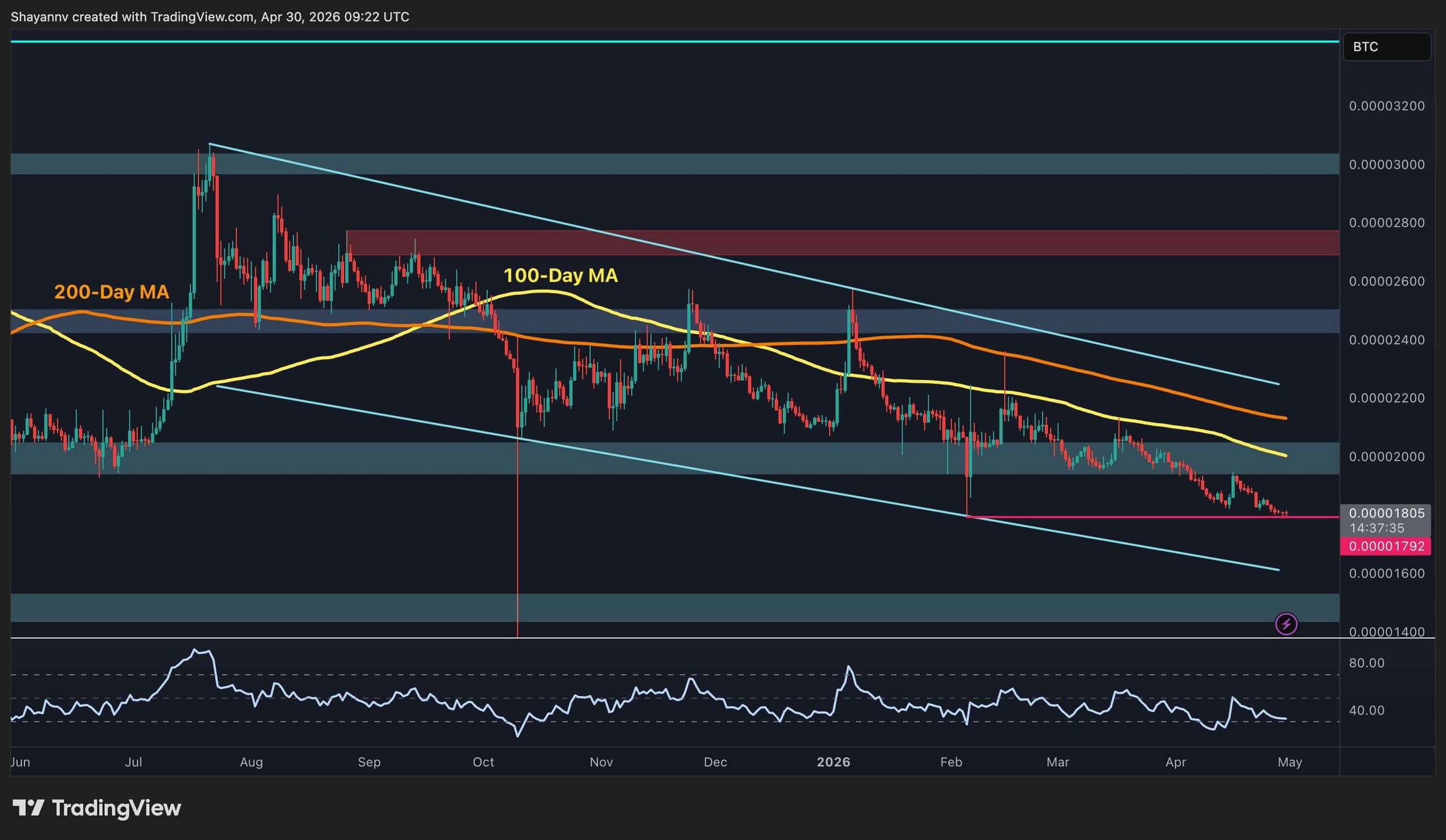 Against Bitcoin, the picture has continued to deteriorate. XRP/BTC has slipped further to 1,800 sats, now sitting directly on the horizontal support level visible on the chart and slightly above the descending channel’s lower boundary at 1,600 sats. The RSI on this pair has also weakened below the 40 range, with the softest reading in several weeks. Unlike the USDT pair, which at least reached a neutral 50, the BTC ratio has shown no meaningful recovery attempt at any point during April.