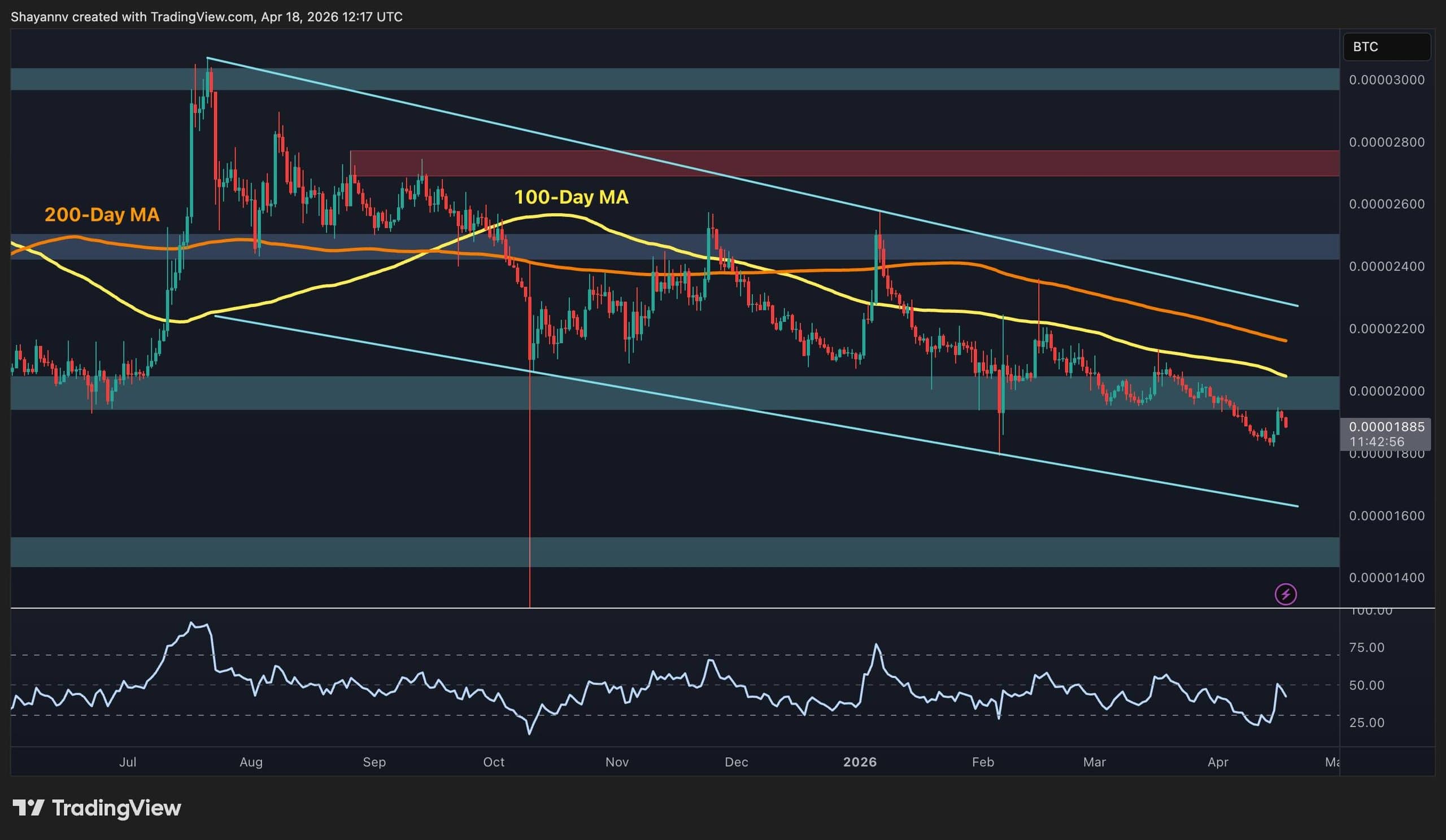 Both the 100-day MA (~2,000 sats) and 200-day MA (~2,100 sats) remain well above and declining, with the descending channel structure firmly intact. The RSI has bounced from deeply oversold territory in the low-20s back toward the mid-40s, which could support a short-term relief bounce on this pair, but a bounce is very different from a reversal.
