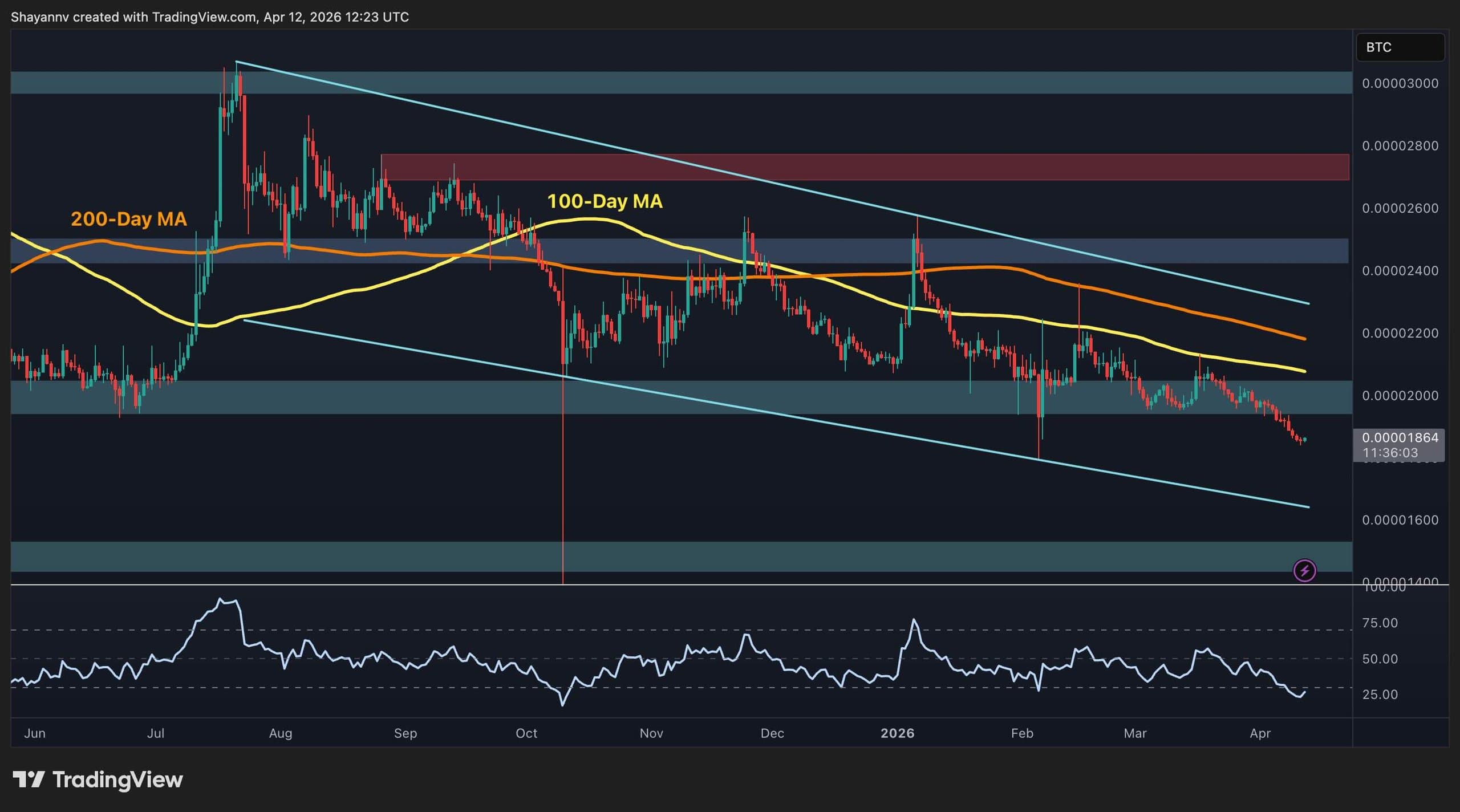 The XRP/BTC pair has deteriorated much more sharply than its USDT pair counterpart. The pair is now trading at approximately 1,864 sats, which is well below the 2,000 sats level that had offered some support through February and March. The breakdown is significant and confirms that XRP is not just falling in dollar terms, but actively losing ground against Bitcoin at an accelerating pace.