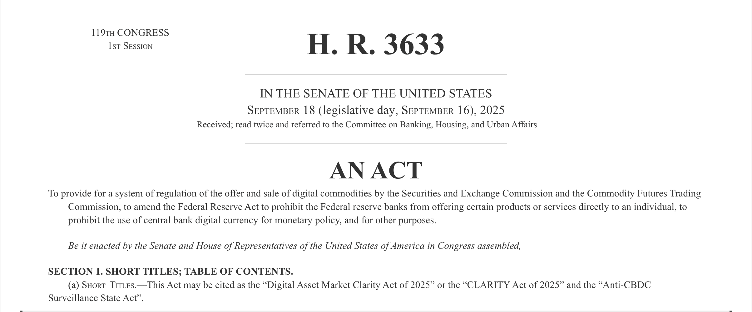 The CLARITY crypto market structure bill. Source: US Congress