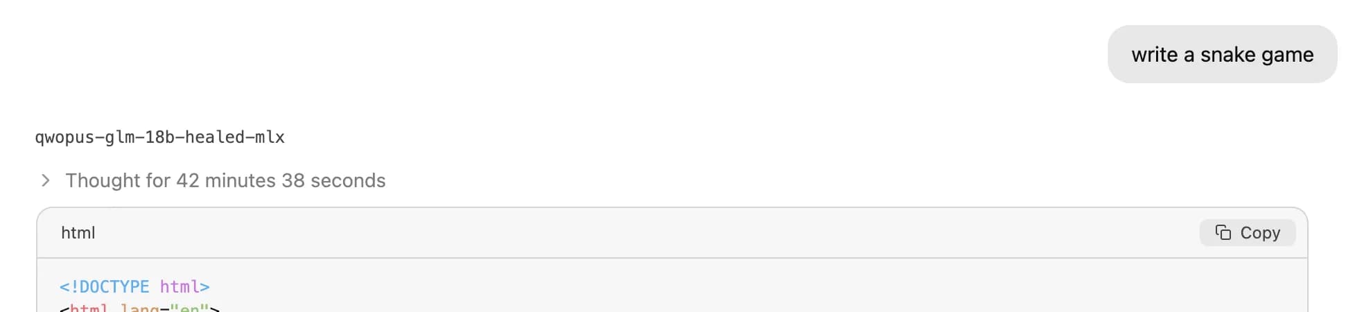 We went a bit softer and things still were challenging. A simple "write a Snake game" prompt took over 40 minutes in reasoning... lots of it.
