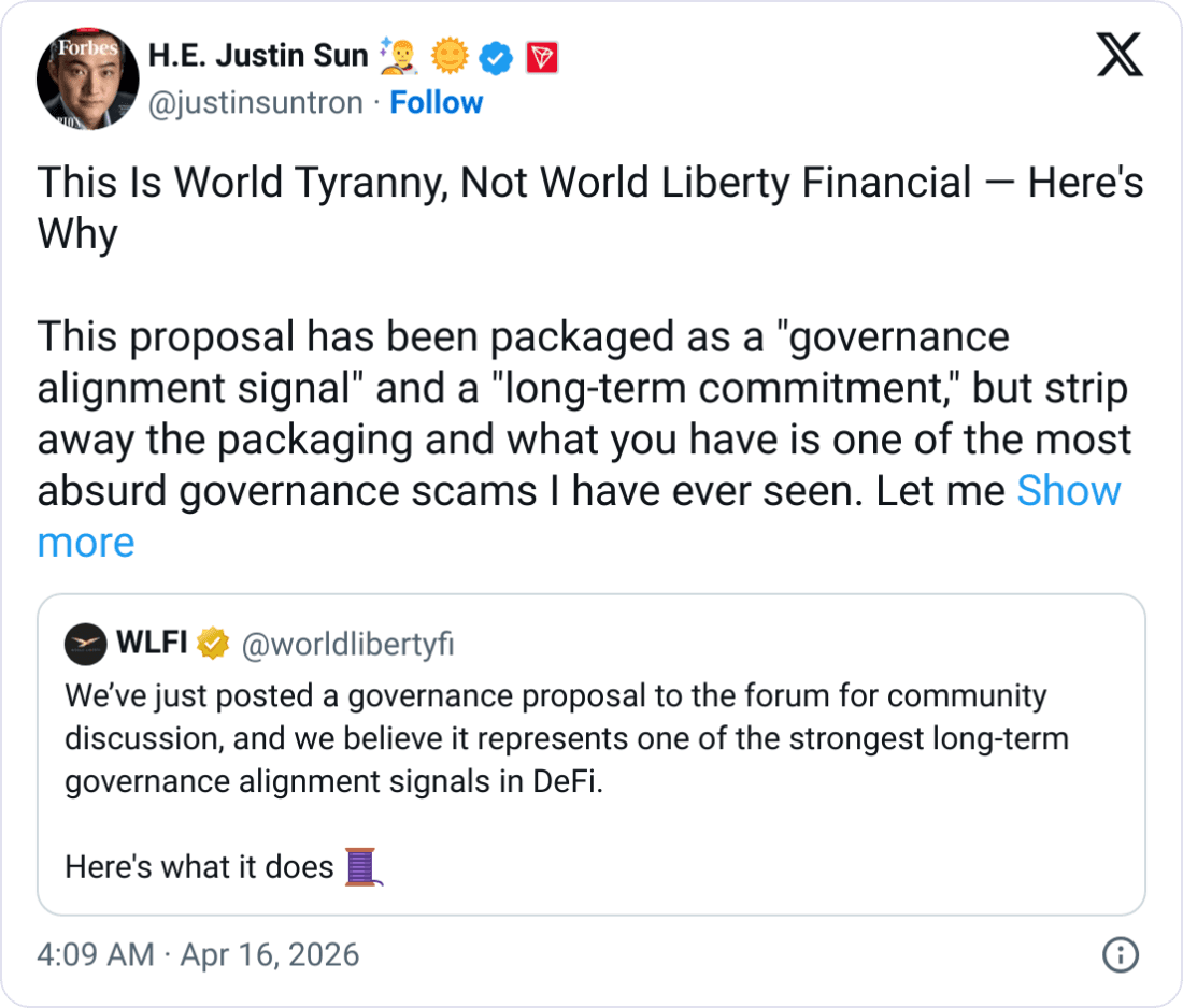 He also took issue with being “forced out of this voting process” due to World Liberty’s freeze of his tokens and claimed that a “large number of holders with significant voting rights are in the same position.”