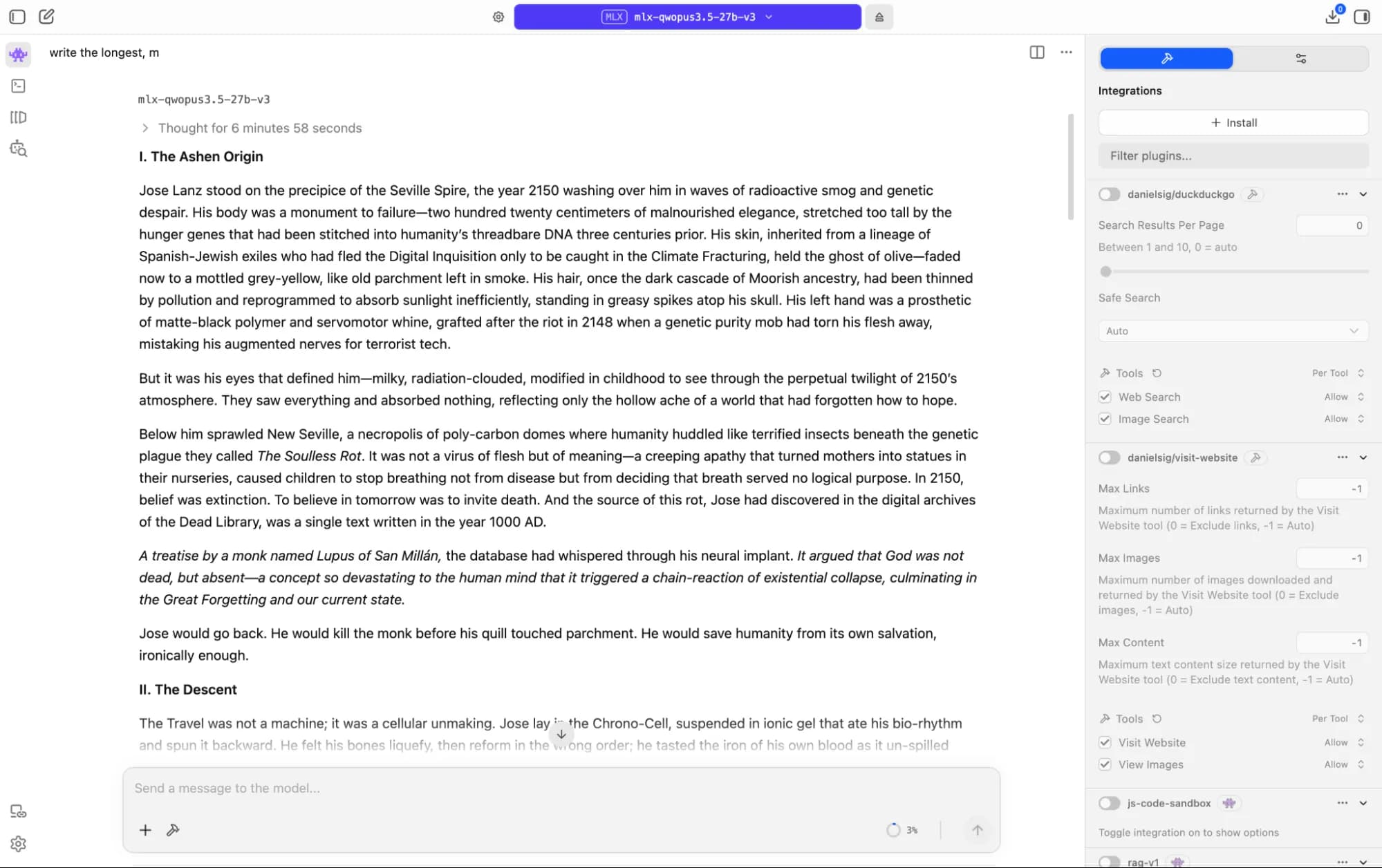 We asked the model to write a dark sci-fi story set between 2150 and the year 1000, complete with a time-travel paradox and a twist. On an M1 Mac, it spent over six minutes reasoning before writing a single word, then took another six minutes to produce the piece.