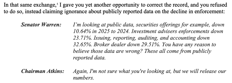 Warren’s letter asked Atkins a series of questions about whether he was aware of the SEC’s enforcement efforts at the time of his testimony and requested that he explain the agency’s decline in enforcement.