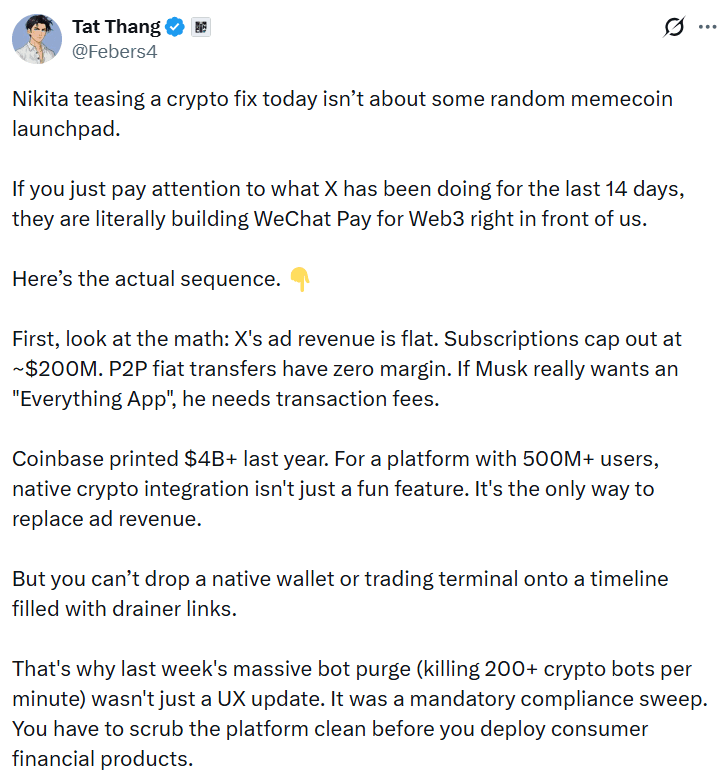 Tat Thang, a partner at prediction platform Polymarket, suggested X is trying to build a Web3 equivalent of WeChat Pay, a Chinese super-app that lets users make mobile payments and transfer money between contacts.