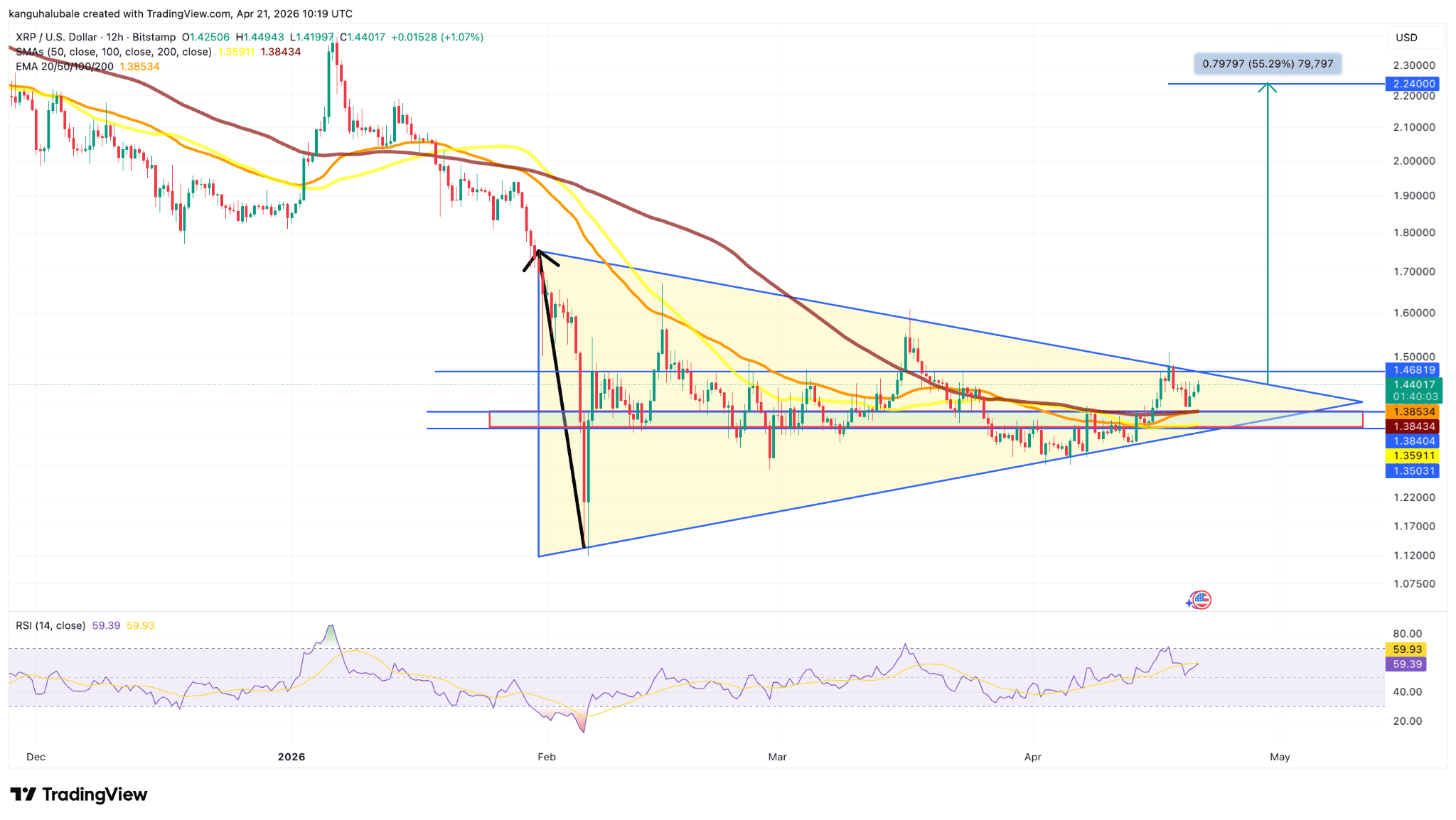 - XRP’s symmetrical triangle projects a 55% rally to $2.40.
